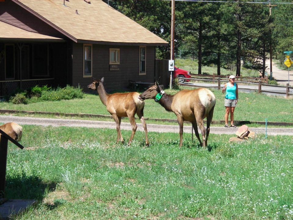 Other than the daytrip detour into Mesa Verde, my “real” visit to Colorado came in July of 2012 when my friend Linda drove up from Santa Fe, picked me up at the Denver airport and took me touring to Rocky Mountain National Park, Estes Park, and the Boulder area. I absolutely enjoyed the sites in Colorado, most prominently the elk roaming in the streets of Estes Park at the base of Rocky Mountain National Park. I had never seen elk before, although now I have visited herds in both Yellowstone and the Allegheny National Forest, and I have a better idea of what to expect in elk behavior and manners, or lack thereof. I was amazed at how brazenly the wild animals roamed the town’s streets, darting under clothelines and behind hedges in their quest for delicious edibles. Of course they were followed across people’s lawns and through gardens by a horde of tourists like myself snapping pictures as we watched them go about their business. Since it was July there was no rutting or bugling going on and the elk were quite peaceful to watch as they moved through the town.