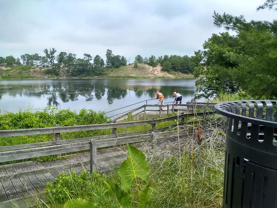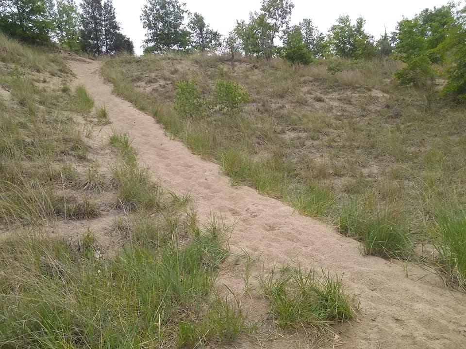 Before I leave Indiana I have to mention one rather unpleasant memory I have. I spent the night on the 9th or 10th floor of a high rise motel the day before I intended to visit Indiana Dunes. In the middle of the night a loud siren sounded and the loudspeaker PA in the motel blared a tornado was approaching the motel and everyone was ordered to go to the basement. Wally and I ventured into the hall and it was complete pandemonium with people everywhere and crowded corridors and elevators. Wally, of course, hated other dogs and scurrying people and I made the decision that if my time was up, my time was up, we would remain in the room. I closed the curtains, made sure the windows were tightly closed, and moved away from them into the bathroom. Wally and I sat on the floor for about 1/2 hour. He was in a frenzy. He hated thunderstorms and the way his hair was standing up on the back of his neck, the mother of all thunderstorms was approaching and we were about to head for Oz just like Dorothy and Toto. In the end, nothing happened although there were tornadoes in the area and some damage did occur. The all clear sounded and we went back to bed after I took Wally out for a late night walk and he calmed down. Actually, given the happy ending to this tale, it really isn’t even an unpleasant memory anymore. It was just one of those things that happens in Indiana. Another thing that happens in Indiana is apparently people walk willy nilly off the paved bike trail into the surrounding dunes, creating footpaths right up a steep dune overlooking Lake Michigan creating not only an eyesore, but probably some erosion as well.