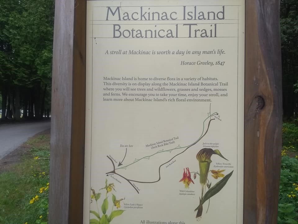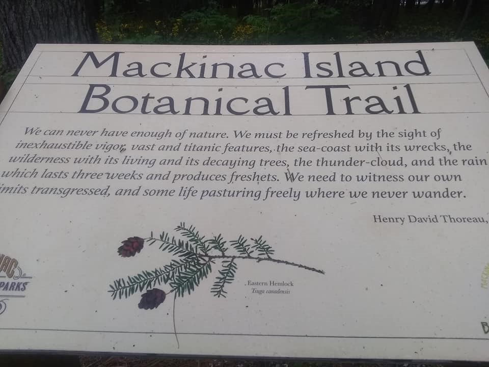 I quickly learned that the Grand Hotel was far from the highlight of Mackinac Island. Our own lovely resort at Mission Point, with its helpful and professional Jamaican staff that return each summer, was one of nicest and most dog friendly places we (Wallie included) have ever stayed. The island itself is a nature and history lover’s paradise. Since I enjoy both I was in heaven taking my daily bike rides hither and yon. I found the Michigan Botanical Trail which was heaven – biking through the woods on a paved bike trail with plaques explaining the flora as I progressed – was like riding through the pages of a very good, well written field guide to local vegetation. I didn’t make quick progress because I had to stop every few hundred feet to read the signs and look at the beautiful plants. Horace Greeley, the educator, got it correct as did Henry David Thoreau as you can see if you read the photos below.