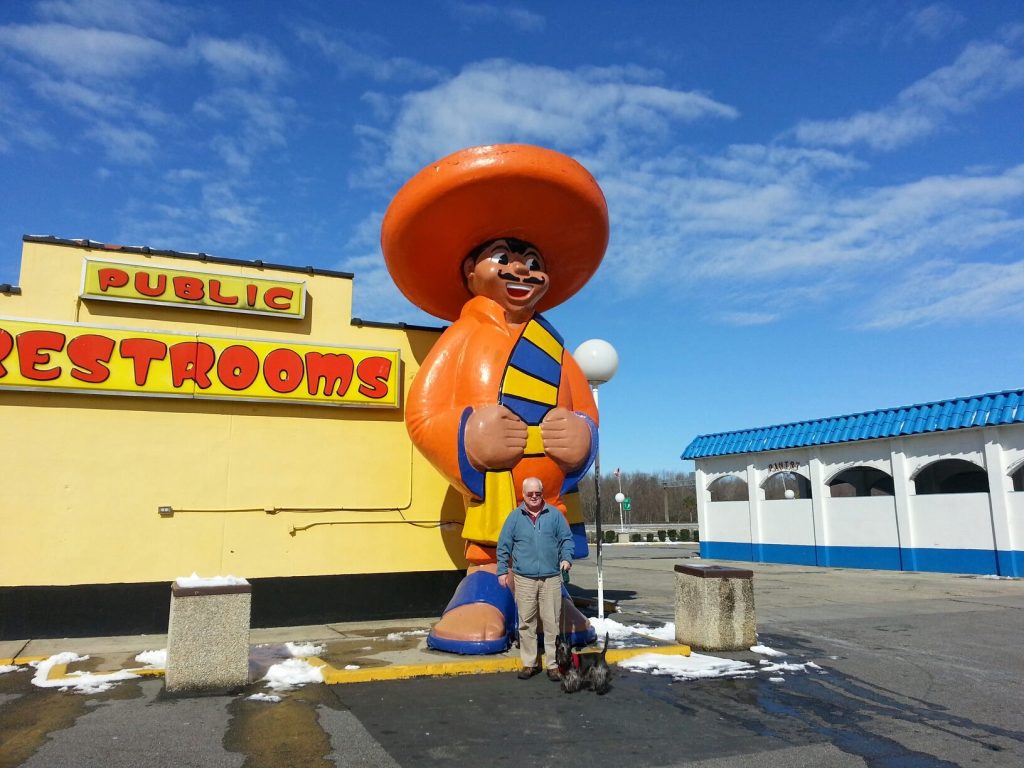 At the beginning of this discussion of South Dakota I mentioned Wall Drug. I should also end the page with a discussion of Wall Drug and its easternmost cousin, Pedros South of Border located just over the North Carolina border near Florence, South Carolina. Both establishments are classic “tourist traps.” Both are located conveniently adjacent to long boring interstates traversed either by truckers or tourists heading for some destination other than the state they find themselves traversing. At Pedros folks are heading to or from Florida and at Wall Drug they are heading to or from the American West and its amazing collection of national parks and ultimately the Pacific Ocean. While folks may start out from either direction, at least at the time these hideous establishments began it was most often people from the northeast or midwest area heading either south or west. When road trips in automobiles became the most normal form of family vacation (during my formative years) cars loaded with families headed off on vacation. They needed someplace to stop and divert the kids’ attention. Pedros bills itself as “America’s Favorite Highway Oasis” for the last 70 years. https://www.sobpedro.com/our-history Wall Drug’s history is even more colorful going back to 1931 when the drug store located in Wall, South Dakota, became famous for its highway signs offering free ice water. The advertising, endless billboards announcing in both directions that you are approaching the famous highway stop, is identical in both cases. And in both cases I am afraid the roadside attraction does not live up to its billing. Nevertheless, I will acknowledge that Wall Drug, while a disappointment, is far better than Pedros. https://www.walldrug.com/about-us However, I adamantly maintain no one can take a road trip through the United States without visiting both places. I have proof, pictures of me proving I have visited them both. (OK, the Pedro picture is of Harold but I took it.)