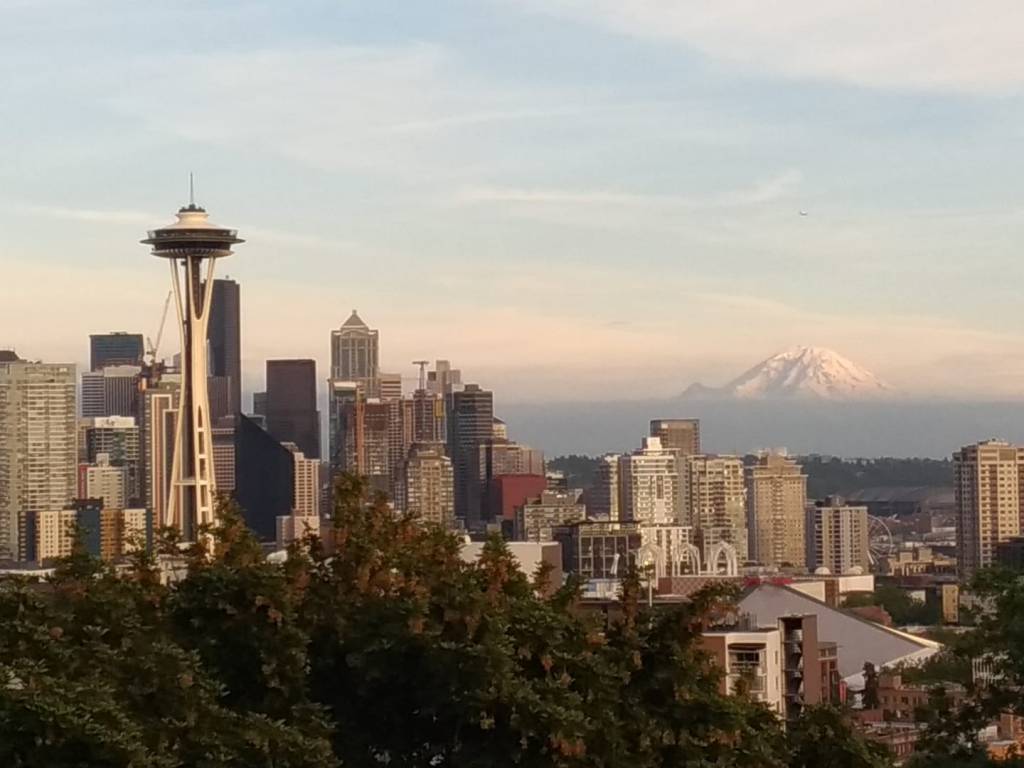 My first trip to Seattle was in 1987 and was work related. I was sent to a conference to learn about child support guidelines, a newfangled method for computing how much child support a noncustodial parent should pay to the custodial parent in the event of divorce. Little did I know at the time that Washington State was to become my daughter’s home after college and that I would make many trips across the country to visit her. From that very first visit I was enchanted by Seattle and the sporadic view of Mt. Ranier. Many of my visits to Seattle did not result in a sighting of the mountain, or perhaps only a brief glimpse from the airplane as we began our descent into SeaTac. It is however sometimes visible from Interstate 5 in downtown Seattle. When these sightings happen, the snow-covered peak is plainly visible and looks you right in the face, taking your breath away. The Washingtonians have a great expression for that experience. They say, “the mountain is out.”